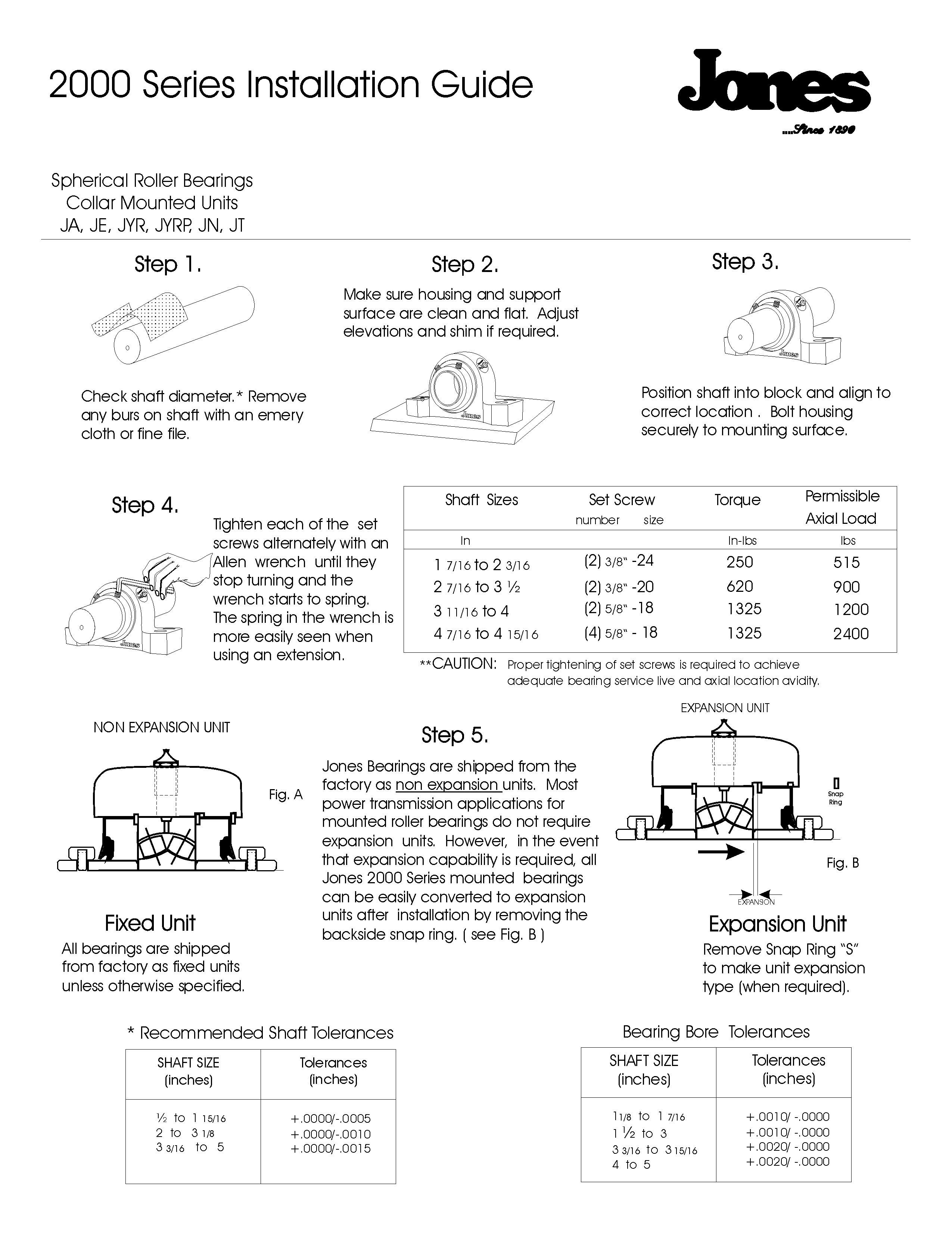 Jones Bearing Company is a manufacturer of Mounted Spherical Roller Bearings and Take-Ups, including S2000, Type E, SAF, Flange, and Piloted Flange Types.